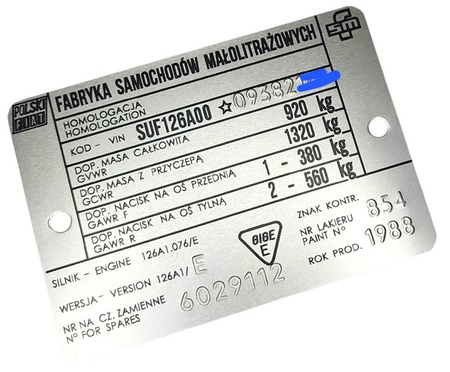 Fiat 126p 1988 rok tabliczka znamionowa tłoczona tłoczony VIN