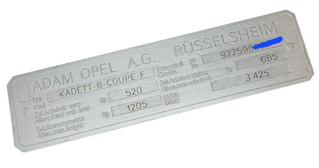 Tabliczka znamionowa aluminiowa do samochodu OPEL Kadett B Coupe F oraz pochodnych modeli Opla. Tabliczka wykonana na wzór tabliczki oryginalnej, Treść jest wyczuwalna pod palcami. Dane pojazdu zostaną naniesione od góry. Podaj dane swojego samochodu do wykonania tabliczki.
