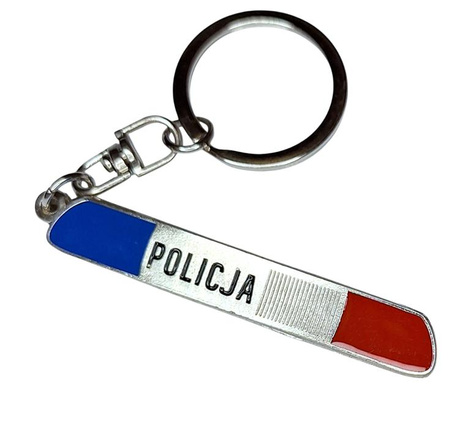 Breloczek metalowy z bleką/kogutami i napisem Policja, Brelok stylizowane na starego typu belkę z kogutami. Wymiar zawieszki 6,5 cm x 1 cm. W ofercie inne breloki dla mudurowych.
