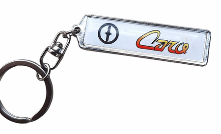 Metalowy breloczek na kółeczku, z logo POLONEZ CARO, logo dwustronne, brelok metalowy z żywicznym wypełnieniem. Wymiar breloczka 58 mm x 15 mm.