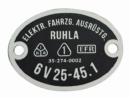 Tabliczka opisowa znamionowa do prądnicy RUHLA EFR, Oznaczenia 6 V 25-45.1. Tabliczka aluminiowa montaż na dwa nity. Stosowane w motocyklach oraz motorowerach Simson S50, S51, SR3, MZ ES, ETS.