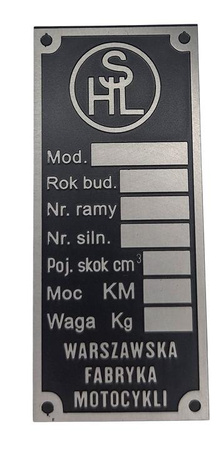 Tabliczka znamionowa aluminiowa do SHL M04 wersja warszawska. Warszawska Fabryka Motocykli. Montaż na cztery nity.
