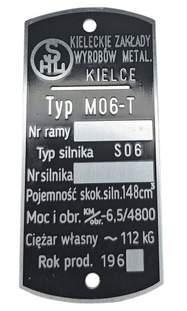 Tabliczka znamionowa replika do motocykla SHL M06-T, typ silnika S06, pojemność silnika 148 cm3 , moc 6,5 KM/4800, ciężar własny 112 kg, rok budowy 196_. Tabliczka aluminiowa, nagłowek KIELECKIE ZAKŁADY WYROBÓW METAL.