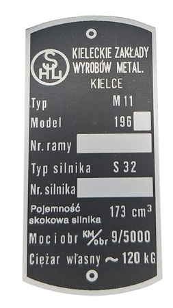 Tabliczka znamionowa do polskiego motocykla SHL M11, pojemność silnika 173 cm3 , moc i obr. 9/5000, cięzar własny 120 kg. Tabliczka aluminiowa, montaż na dwa nity. Nagłówek Kieleckie Zakłady Wyrobów Metalowych KIELCE.