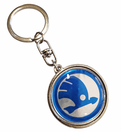 Metalowy breloczek przedstawiający logo marki Skoda. Breloczek jest wykonany z metalu i pokryty jest warstwą niklu. Brelok jednostronny o średnicy 38 mm. Grafika w formie naklejki żelowej. W ofercie inne breloczki do pojazdów z PRLu.