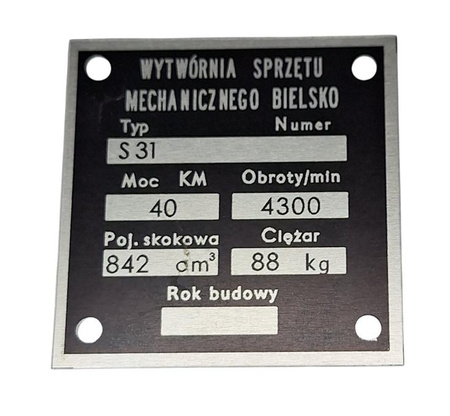 Tabliczka znamionowa przeznaczona na blok silnika w Syrenie 104/105/R20/Bosto. Tabliczka montowana w przedniej części bloku silnika S31. Blaszka aluminiowa montowana na cztery nity,