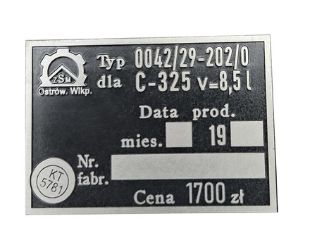 Tabliczka znamionowa metalowa do ciągnika Ursus C325 na chłodnicę układu chłodzenia. Tabliczka wykonana na wzór oryginalnej tabliczki. Dane z tabliczki: ZSM Ostrów, Typ 0042/29-202/0, C 325, v=8,5l, cena 1700 zł. W ofercie tabliczki znamionowe na cały ciągnik oraz inne częsci.