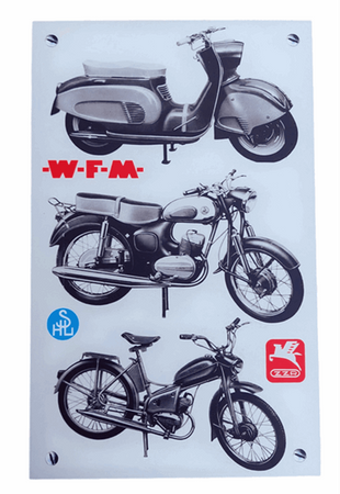 Tablica plastikowa z motocyklami WFM OSA, SHL M11 oraz Komar 232. Tablica plastikowa z trwałym nadrukiem, wymiar 25 cm x 40 cm, grubość 3 mm. Zapraszamy po inne ciekawe tablice i tabliczki rodem z PRL.