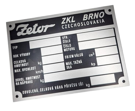 Tabliczka identyfikacyjna do Zetora 4511 5211 5511, tabliczka w języku czeskim wykonana z blachy aluminiowej. Najlepsza wersja tabliczki na rynku. Skorzystaj z usługi znakowania tabliczki oraz postarzenia. Polecamy!