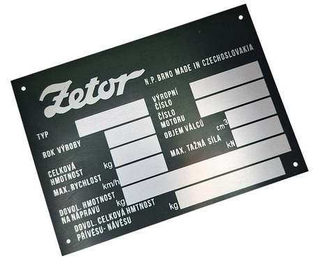 Oferuję wykonanie tabliczki opisowej znamionowej aluminiowej głównej ZETOR uniwersalna wzór nr. 2. Wersja w języku czeskim, czarne tło, napis MADE IN CZECHOSLOVAKIA.