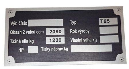Tabliczka opisowa znamionowa do traktora Zetor T25, A25, K25. Tabliczka stosowana w kilku modelach, montaż na desce rozdzielczej. Wierna kopia zachowaniem czcionek oraz wymiarów. Polecamy usługę wybicia numerów oraz postarzenia tabliczki. Tylko u nas najlepsze tabliczki znamionowe do pojazdów zabytkowych.