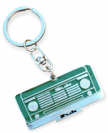 Metalowy breloczek przedstawiający przód polskiego dostawczaka marki Żuk w kolorze ciemno zielonym. Breloczek jest wykonany z metalu i pokryty jest warstwą niklu. Maska jest pomalowana specjalną utwardzoną trwałą żywicą. Brelok jednostronny o wymiarach: 5 cm x 2,7 cm. W ofercie inne kolory i wzory.